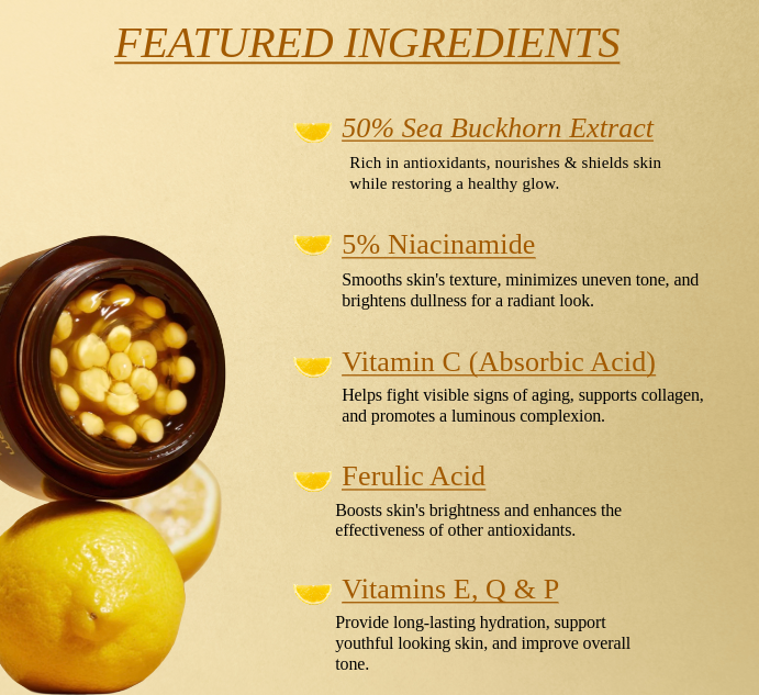 50% Sea Buckhorn Extract- Packed with antioxidants, this extract helps sheild skin from environmental stress while delivering deep hydation and nourishment. It leaves skin feeling soft, supple, and refreshed.