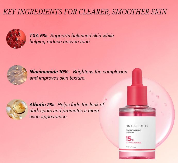Experience the all in-in-one 72-hour serum designed to target dark spots, acne scars, uneven tone, and rough texture. Formulated with 10 layers of hyaluronic acid, Panthenol, and, and Betaine, this lightweight, fragrance-free serum deeply hydrates while staying gentle on the skin. Panthenol and Coral Moss Extract help calm and soothe for a balanced, refreshed complexion. With 5% Tranexamic Acid, Omari-beauty's highest TXA strength, this formula works to fade stubborn marks while strengthening the skin barrier.